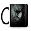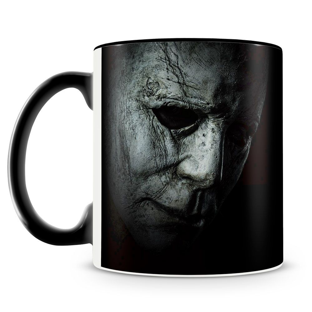 Caneca personalizada de porcelana de alto brilho, interior e alça preta com estampa do filme Halloween.